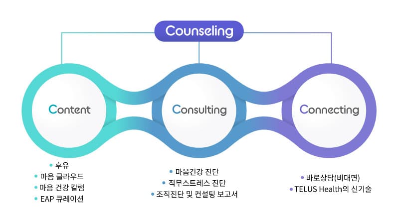 이와 같은 문제점을 극복하고자 이지앤웰니스는 대면상담 중심의 EAP서비스를 보완하는데 필요한 세 가지 요소를 찾아냈는데요. 이 세 가지 요소는 다양한 콘텐츠(Content), 조직 차원의 전문적 컨설팅(Consulting), 디지털 신기술을 통한 연결(Connecting)을 의미해요.