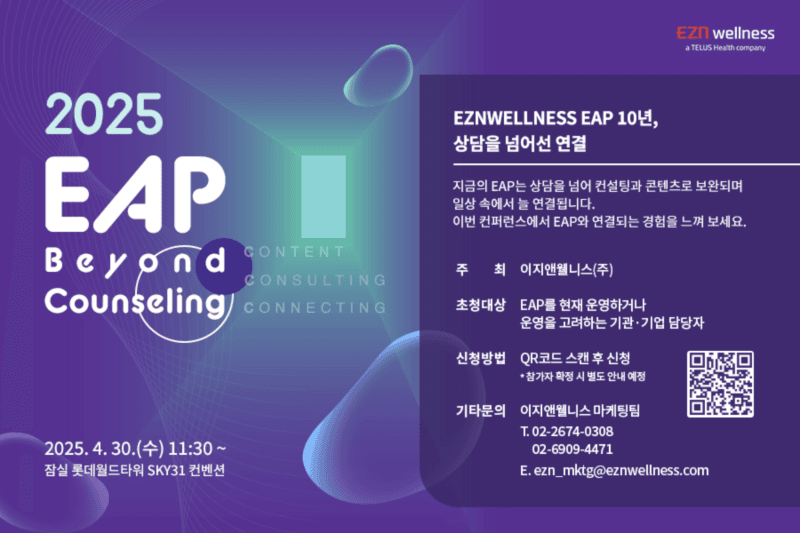 창사 10주년을 즈음하여, 바로 지금, 2025년에 필요한 EAP의 방향을 보여주는 확장된 EAP를 제시하고자 오는 4월 30일, 이지앤웰니스에서 2025 EAP 컨퍼런스 “EAP, Beyond Counseling”를 개최합니다.